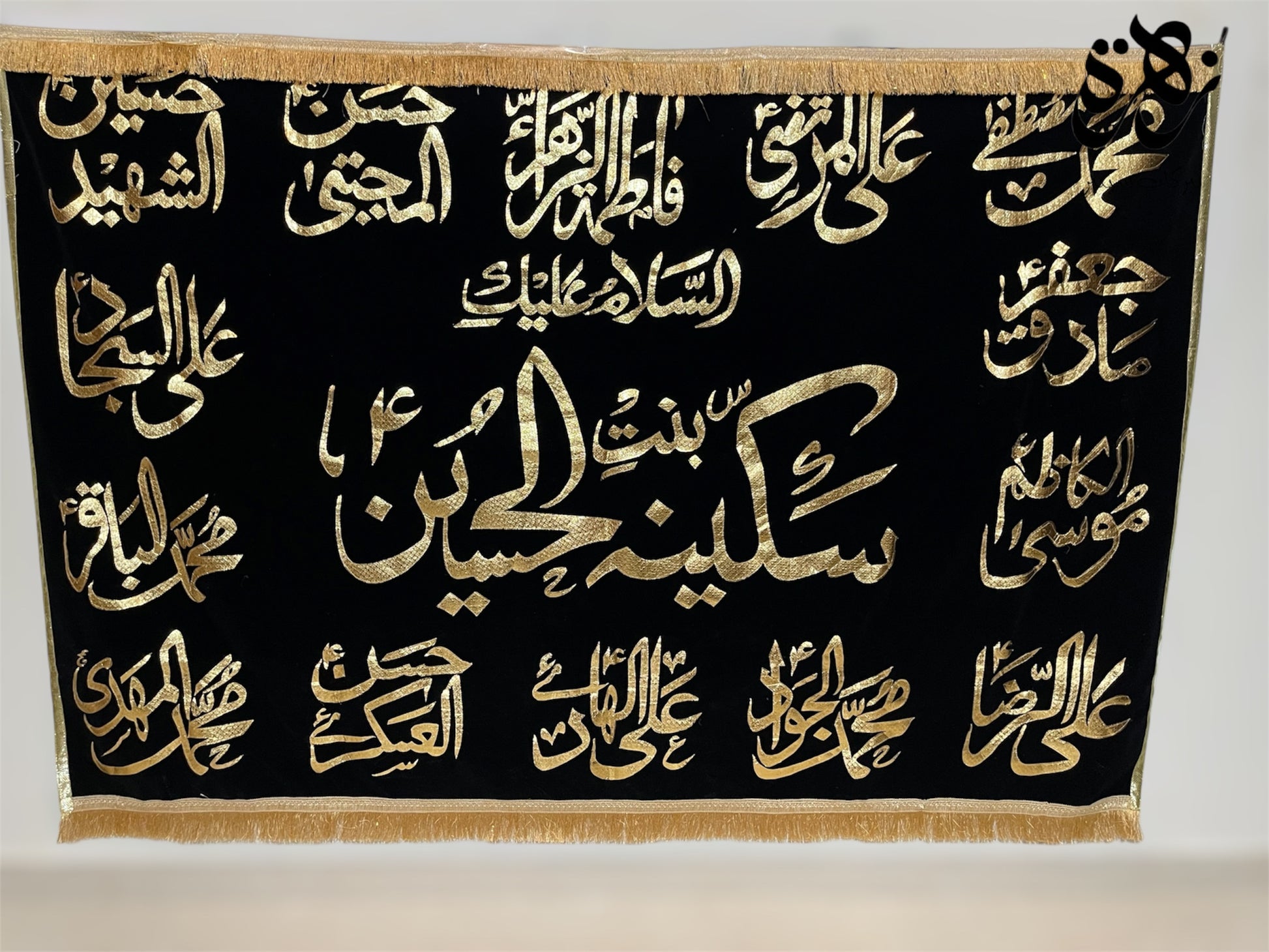 A premium black velvet wall hanging honoring Mola Hussain (AS), showcasing السلامُ علیکِ یا شہزادی سکینہ بنت الحسین علیہ السلامin golden applic. The sides are adorned with the names of the 14 Masoomeen in a striking blend of golden applic work.