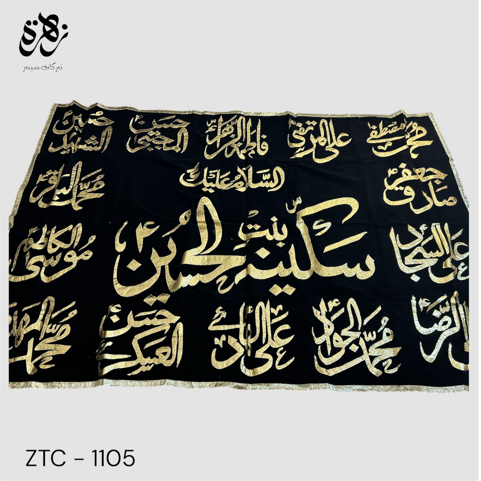 Black Banner of Ya Sakina bint ul Hussain SA with 14 Masoomeen AS names golden applic work banner for Majlis
