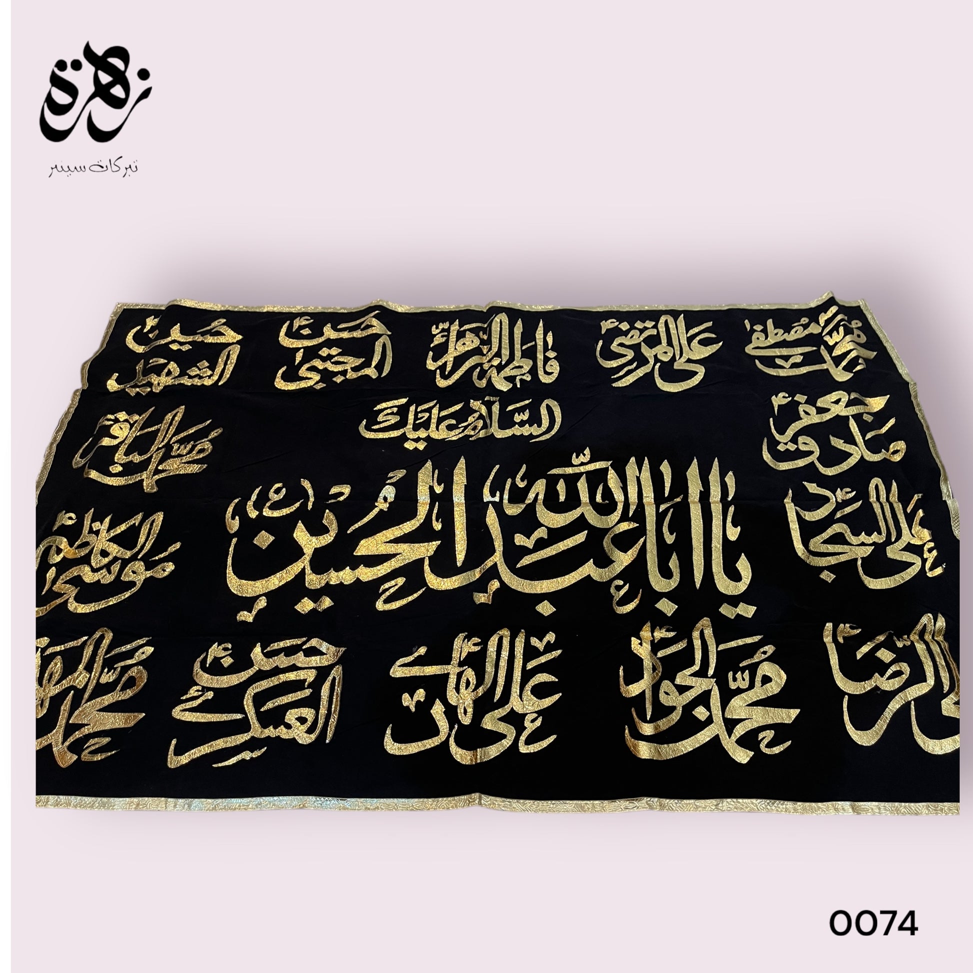 Black Banner Ya Aba Abdullah Imam Hussain (as) السلام عليك يا أبا عبد الله in Golden Applic work with 14 Masoomeen AS name